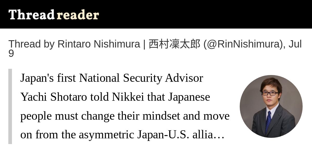 Thread by @RinNishimura on Thread Reader App @RinNishimura: Japan’s first National Security Advisor Yachi Shotaro told Nikkei that Japanese people must change their mindset and move on from the asymmetric Japan-U.S. alliance toward a more autonomous state in w……